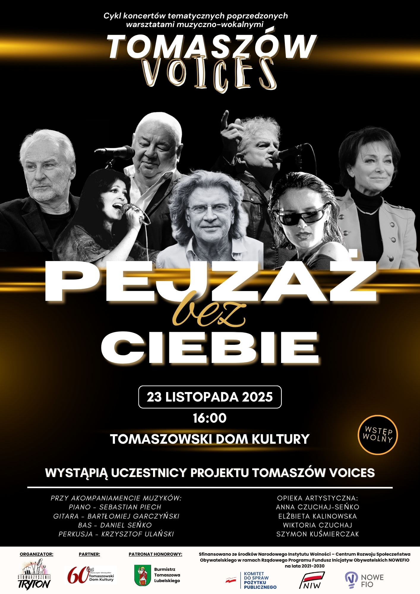 23 listopada 2025 r. w Tomaszowskim Domu Kultury odbył się siódmy koncert projektu CYKL KONCERTÓW TEMATYCZNYCH POPRZEDZONYCH WARSZTATAMI MUZYCZNO-WOKALNYMI TOMASZÓW VOICES, który nosił tytuł „Pejzaż bez Ciebie”. Wydarzenie wypełniło salę nastrojem zadumy, refleksji i wspólnego wspominania artystów, których twórczość na zawsze pozostanie ważną częścią polskiego dziedzictwa muzycznego. Podczas koncertu przypomniano utwory legend sceny – m.in. Anny Jantar, Kory, Zbigniewa Wodeckiego, Krzysztofa Klenczona oraz Andrzeja Zauchy. Ich ponadczasowe piosenki, wykonane przez lokalnych wokalistów – dzieci, młodzież i dorosłych – zabrzmiały w nowych, poruszających interpretacjach, podkreślając siłę i aktualność artystycznego dorobku minionych pokoleń. Występy uczestników udowodniły, że muzyka potrafi budować wspólnotę i otwierać przestrzeń dla wspólnej wrażliwości. Wyjątkowym momentem wieczoru był finał, w którym zabrzmiała przejmująca aranżacja utworu „Dziwny jest ten świat” Czesława Niemena. Po ostatnich dźwiękach publiczność trwała w chwili wzruszającej ciszy, by następnie nagrodzić wykonawców owacjami na stojąco. Koncert zwieńczyło wspólne wykonanie „Tolerancji” Stanisława Soyki – utworu podkreślającego wartości bliskie idei projektu: szacunek, empatię i jedność.